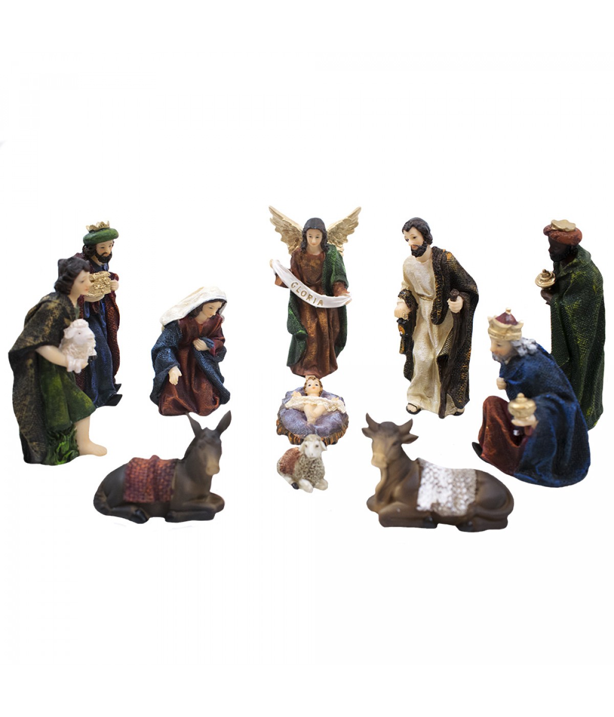 Presépio 14,5 cm de altura sendo um dos Rei Mago a peça mais alta com 14,5 cm de altura. As peças que formam o Presépio são: Menino Jesus, Maria, José, Pastor, 3 reis magos, Melquior, Baltazar e Gaspar, Anjo, Burro, Boi e Ovelha.