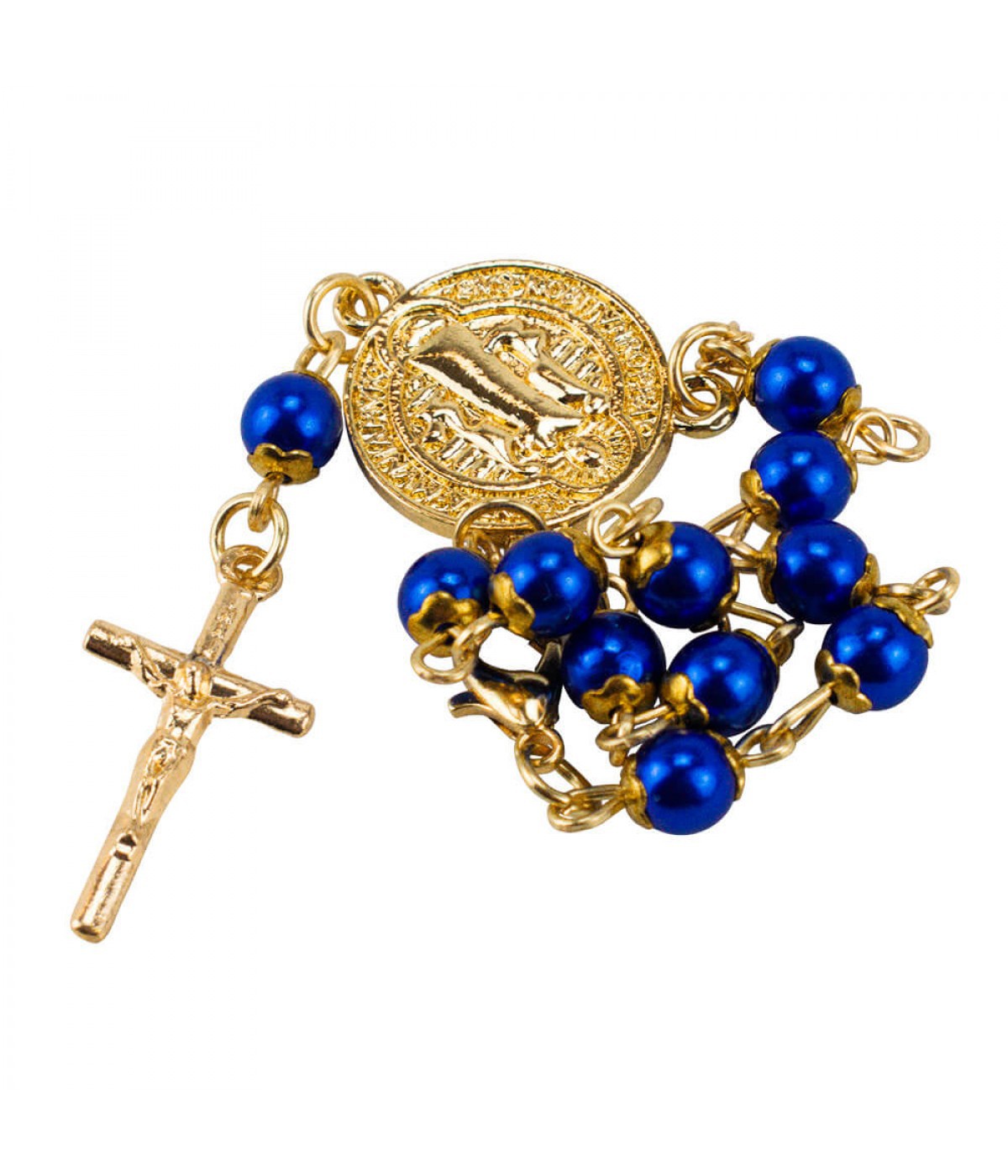 Pulseira com 5 cm de dimensão. Vem como um terço em que as contas são na cor azul e tem 0.7 cm de diâmetro junto com um enfeite dourado na imagem de medalhão de São Bento e um Crucifixo. Ajuste pela corrente.