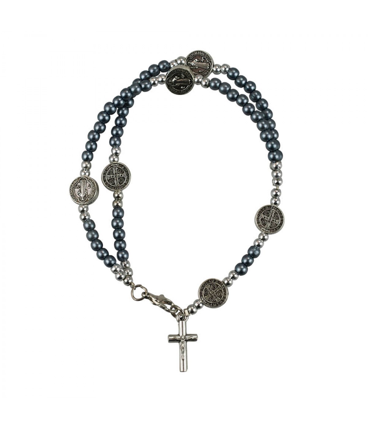 Pulseira com 7.5 cm de dimensão. Vem como um terço em que as contas são na cor cinza e tem 0,5 cm de diâmetro junto com um enfeite na imagem do Crucifixo. Ajuste pela corrente.