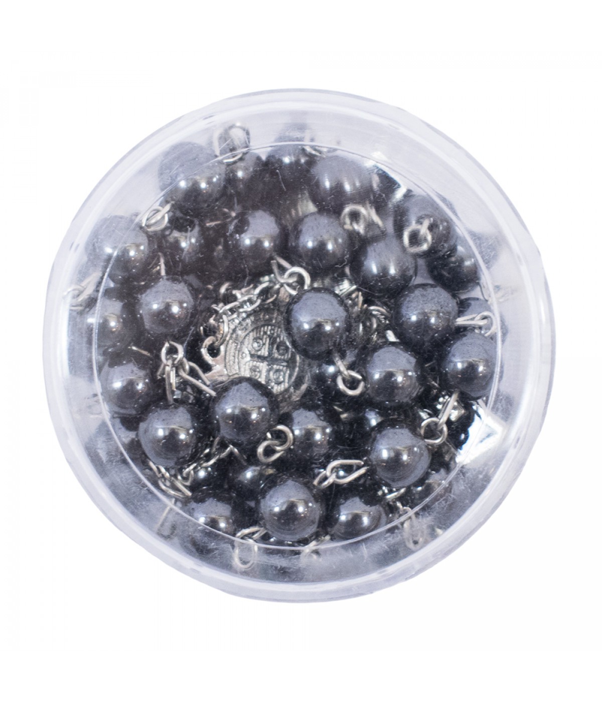 Terço em tons escuros, corrente na cor prateada e contas de 1 cm de diâmetro na cor preta Acinzentada. Entre a cruz e as contas, um enfeite com imagem de São Bento.