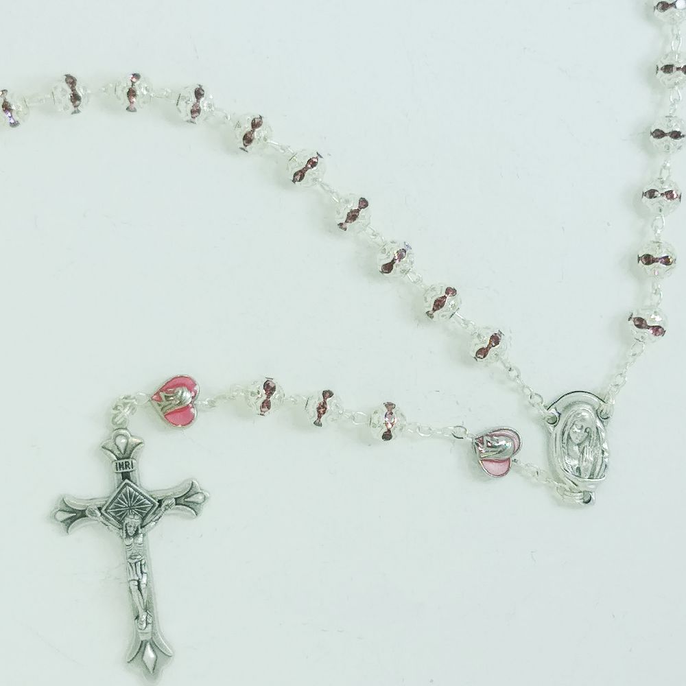 Terço Coração Cristal Metalizado Rosa 6mm